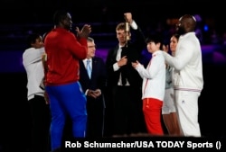 Париждин мэри Анна Идальго Олимпиаданын желегин Томас Бахга, ал аны Лос-Анжелестин мэри Карен Басска өткөрүп берди.