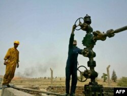 Жумушчулар Киркук мунай кенинен өндүрүлгөн мунайдын агымын текшеришүүдө.